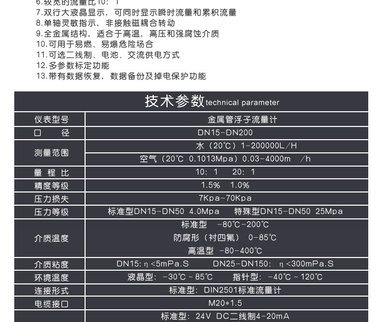 金屬管浮子流量計是工業(yè)自動化過程控制中常用的一種面積流量測量儀表。它具有體積小,檢測范圍大,使用方便等特點。它可用來測量液體、氣體以及蒸汽的流量,特別適宜低流速小流量的介...