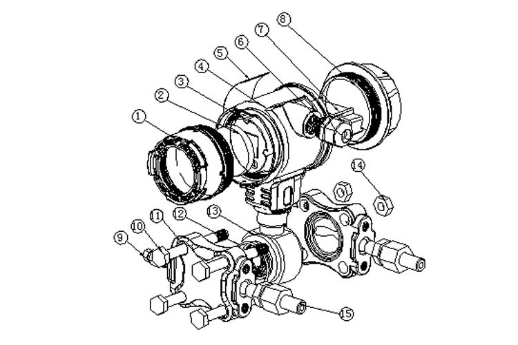 1.表頭前蓋 2. 前蓋鏡片 3.表頭 4.殼體 5.銘牌標簽 6.防爆接頭 7.接線端子 8.表頭后蓋 9.放泄閥 10. 螺栓 11.夾板 12.傳感器密封圈 13.傳感器 14.螺母 15.焊管接頭組件